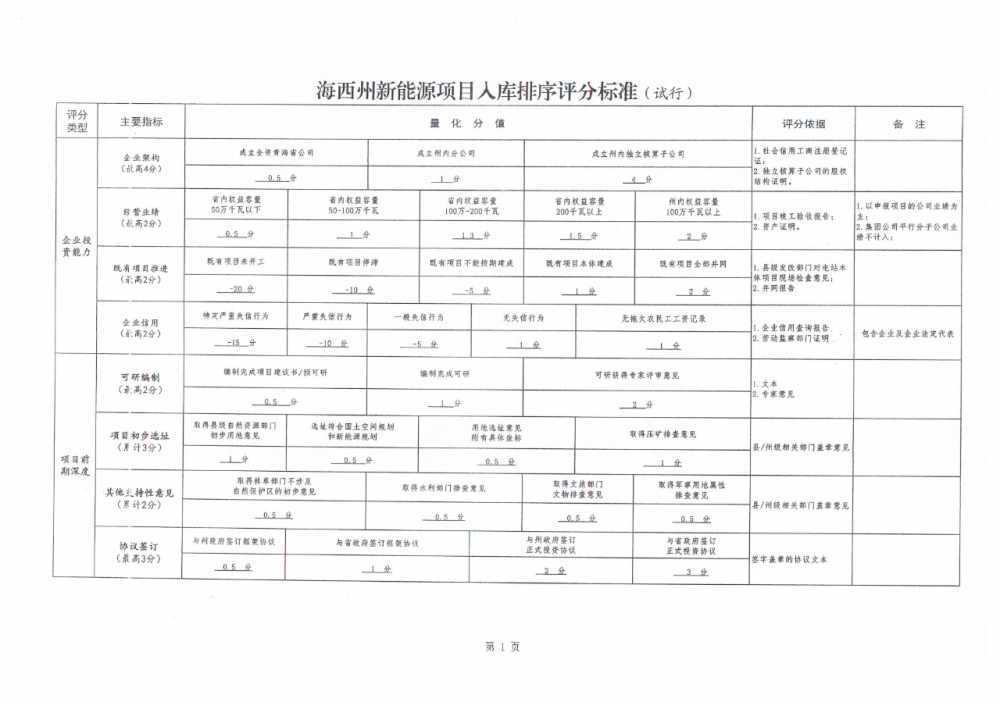 1月19日,青海海西州發(fā)改委印發(fā)《新能源項(xiàng)目入庫(kù)排序評(píng)分標(biāo)準(zhǔn)》,通過(guò)八大類35小項(xiàng)的評(píng)分類型對(duì)新能源項(xiàng)目進(jìn)行評(píng)分排序。