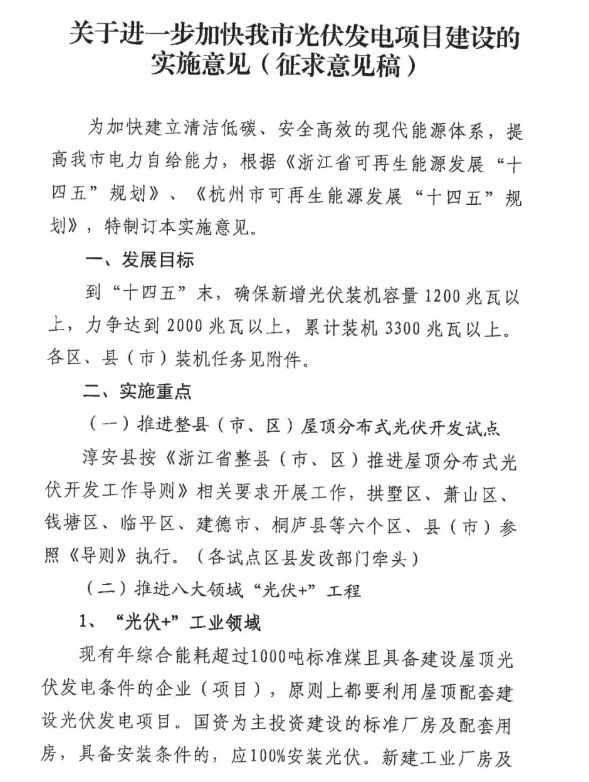 近日,杭州市發(fā)改委發(fā)布了一則關(guān)于征求《關(guān)于進(jìn)一步加快我市光伏發(fā)電建設(shè)的實(shí)施意見(征求意見稿)》意見的函。