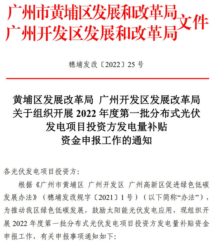 原標(biāo)題:黃埔區(qū)發(fā)展改革局 廣州開(kāi)發(fā)區(qū)發(fā)展改革局 關(guān)于組織開(kāi)展2022年度第一批分布式光伏發(fā)電項(xiàng)目投資方發(fā)電量補(bǔ)貼資金申報(bào)工作的通知