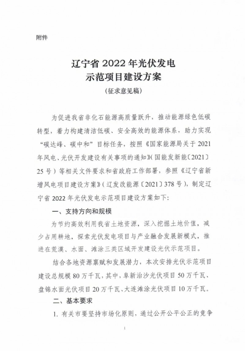 遼寧發(fā)布2022年光伏示范項目建設方案征求意見稿