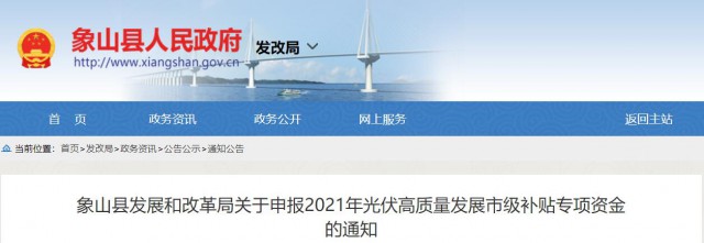 7月5日,浙江象山縣發(fā)展和改革局關(guān)于申報(bào)2021年光伏高質(zhì)量發(fā)展市級(jí)補(bǔ)貼專項(xiàng)資金的通知發(fā)布。