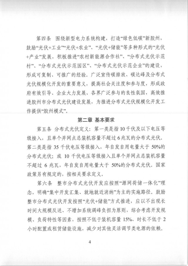 近日,山東膠州市發(fā)改委發(fā)布了《膠州市整市分布式光伏開(kāi)發(fā)工作指導(dǎo)意見(jiàn)》。文件要求,整市分布式光伏開(kāi)發(fā)應(yīng)按照“源網(wǎng)荷儲(chǔ)一體化”理念,明確“集中開(kāi)發(fā)匯集、就地就近消納”為主的實(shí)施路徑。鼓勵(lì)整市分布式光伏開(kāi)發(fā)按照“光伏+儲(chǔ)能”方式推進(jìn),應(yīng)以不出現(xiàn)長(zhǎng)時(shí)間大規(guī)模反送、不增加系統(tǒng)調(diào)峰負(fù)擔(dān)為原則,綜合考慮開(kāi)發(fā)規(guī)模、負(fù)荷特性等因素,按照不低于裝機(jī)容量15%、時(shí)長(zhǎng)不低于2小時(shí)配置或租賃儲(chǔ)能設(shè)施,減少對(duì)其他靈活調(diào)節(jié)類(lèi)電源的依賴(lài)。