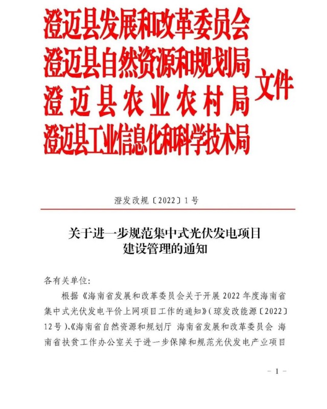 9月28日,澄邁縣政府網(wǎng)發(fā)布“關(guān)于進一步規(guī)范集中式光伏發(fā)電項目建設(shè)管理的通知”。