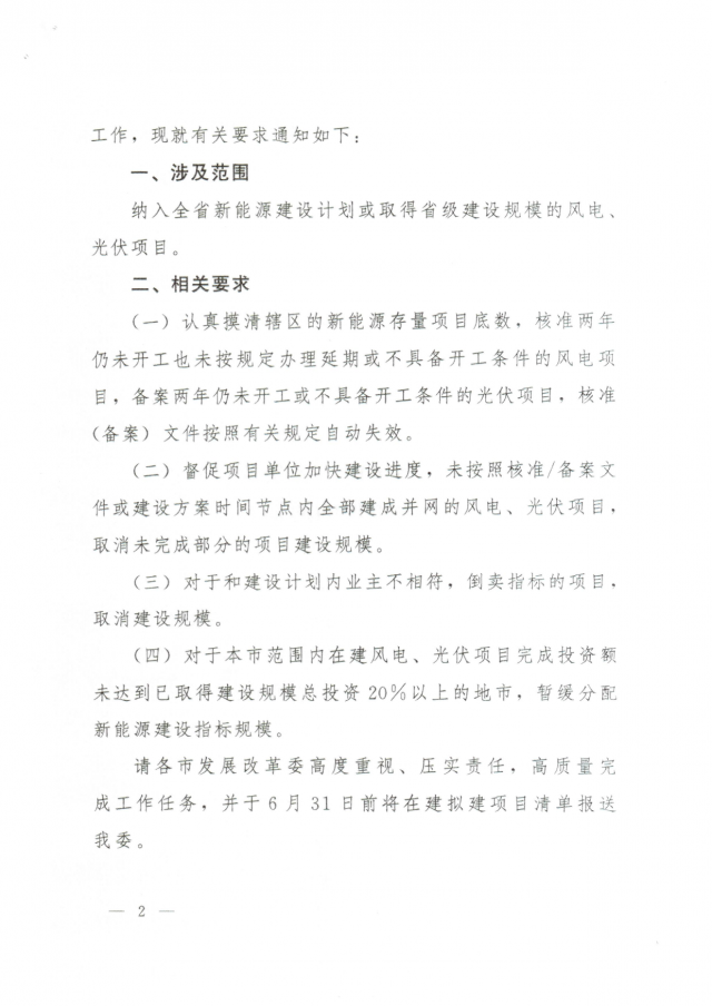 督促項(xiàng)目單位加快建設(shè)進(jìn)度,未按照核準(zhǔn)/備案文件或建設(shè)方案時(shí)間節(jié)點(diǎn)內(nèi)全部建成并網(wǎng)的風(fēng)電、光伏項(xiàng)目,取消未完成部分的項(xiàng)目建設(shè)規(guī)模。