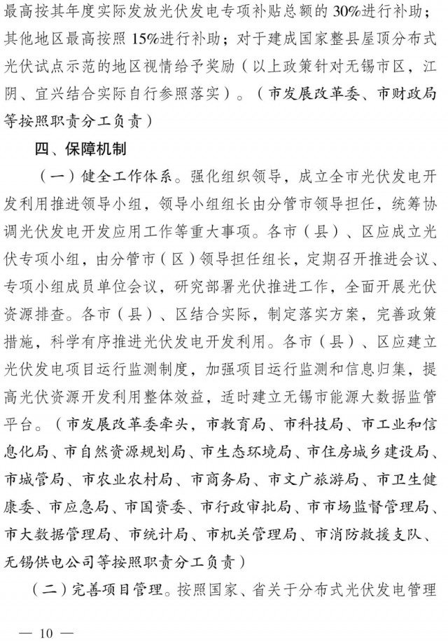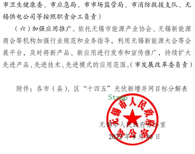 此外,“十四五”期間,對于完成新增并網(wǎng)目標,安排光伏發(fā)電補貼資金并落實補貼的地區(qū),市級自 2022年起分年度給予補助。對納入全國整縣(市、區(qū))屋頂分布式光伏開發(fā)試點的地區(qū),最高按其年度實際發(fā)放光伏發(fā)電專項補貼總額的30%進行補助;其他地區(qū)最高按照15%進行補助;對于建成國家整縣屋頂分布式光伏試點示范的地區(qū)視情給予獎勵(以上政策針對無錫市區(qū),江陰、宜興結(jié)合實際自行參照落實)。