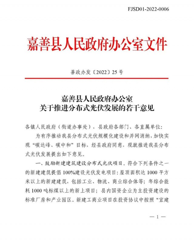 10月14日,嘉善政府網(wǎng)發(fā)布“關(guān)于推進(jìn)分布式光伏發(fā)展的若干意見”。