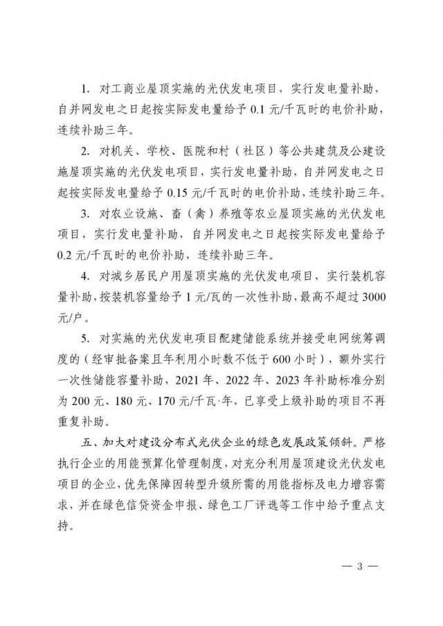 4.對(duì)城鄉(xiāng)居民戶用屋頂實(shí)施的光伏發(fā)電項(xiàng)目,實(shí)行裝機(jī)容量補(bǔ)助,按裝機(jī)容量給予1元/瓦的一次性補(bǔ)助,最高不超過3000元/戶。