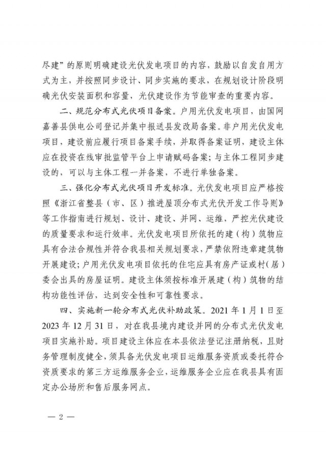 實(shí)施新一輪分布式光伏補(bǔ)助政策。2021年1月1日至2023年12月31日,對(duì)在我縣境內(nèi)建設(shè)并網(wǎng)的分布式光伏發(fā)電項(xiàng)目實(shí)施補(bǔ)助。項(xiàng)目建設(shè)主體應(yīng)在本縣依法登記注冊納稅,且財(cái)務(wù)管理制度健全,須具備光伏發(fā)電項(xiàng)目運(yùn)維服務(wù)資質(zhì)或委托符合資質(zhì)要求的第三方運(yùn)維服務(wù)企業(yè),運(yùn)維服務(wù)企業(yè)應(yīng)在我縣具有固定辦公場所和售后服務(wù)網(wǎng)點(diǎn)。