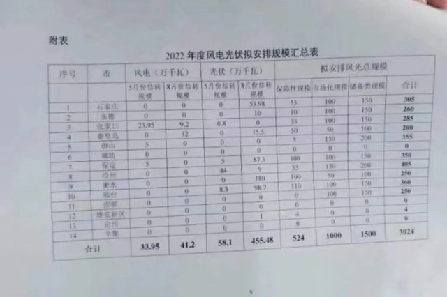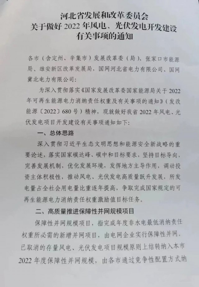 近日,河北省發(fā)改委發(fā)布《關(guān)于做好2022年風(fēng)電、光伏發(fā)電開發(fā)建設(shè)有關(guān)事項的通知》,根據(jù)文件:河北2022年擬安排保障性風(fēng)電、光伏規(guī)模5.24GW,市場化規(guī)模10GW、儲備規(guī)模15GW。
