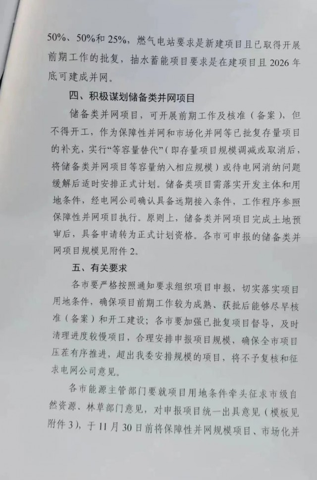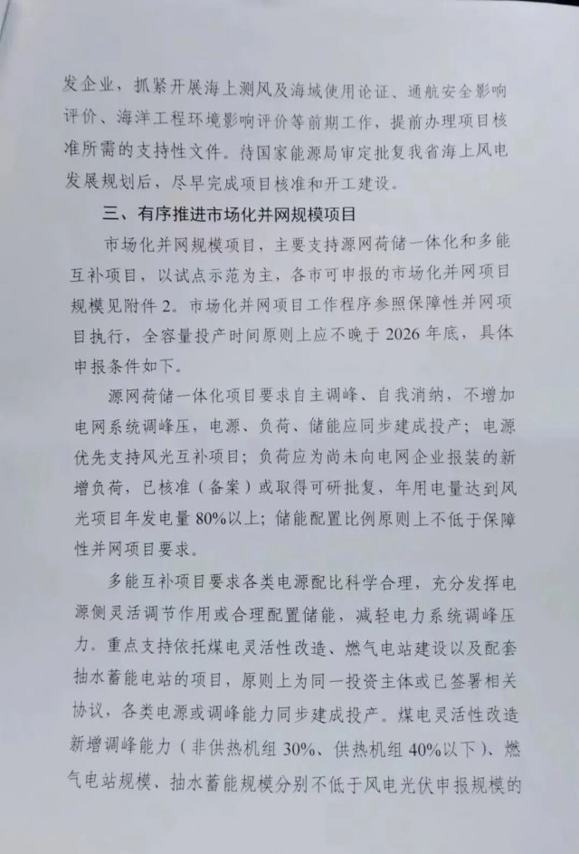 市場化項目參照保障性并網(wǎng)項目執(zhí)行,源網(wǎng)荷儲一體化項目年用電量要達(dá)到風(fēng)、光項目年發(fā)電量的80%以上,儲能配置要求不得低于保障性項目。多能互補(bǔ)項目煤電新增調(diào)峰能力、燃?xì)怆娬?、抽水蓄能?guī)模不得低于風(fēng)、光申報規(guī)模的50%、50%、25%。市場化項目全容量投產(chǎn)時間不晚于2026年底。