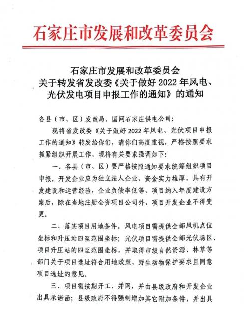 11月7日,河北省石家莊市發(fā)改委印發(fā)《關(guān)于做好2022年風(fēng)電、光伏發(fā)電項(xiàng)目申報(bào)工作的通知》,要求項(xiàng)目需按期開(kāi)工、并網(wǎng),并由縣級(jí)政府和開(kāi)發(fā)企業(yè)出具承諾函;縣級(jí)政府不得強(qiáng)制增加其它附加條件,并出具承諾函。