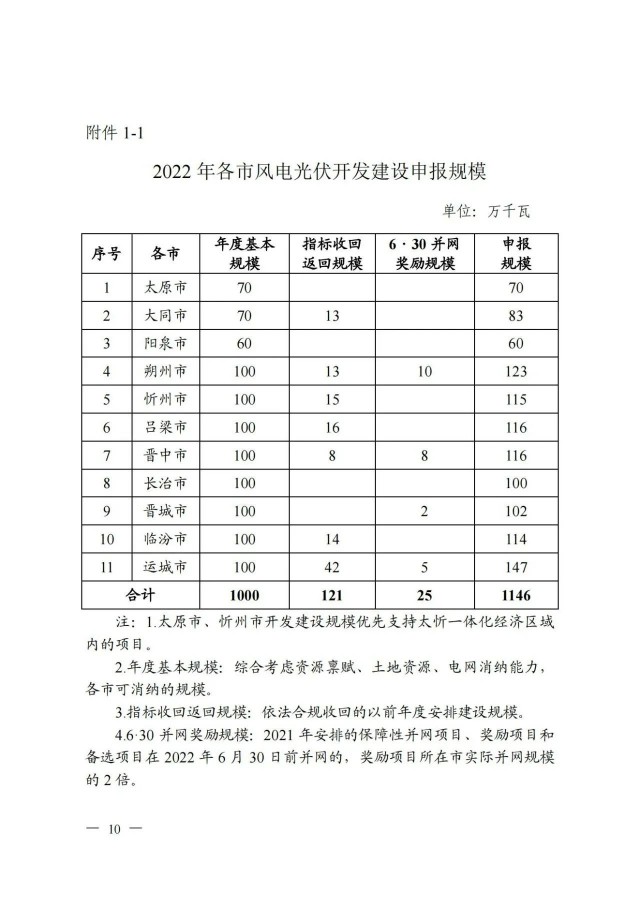 近日,索比光伏網(wǎng)獲悉,山西省能源局印發(fā)《關(guān)于做好2022年風(fēng)電、光伏發(fā)電開發(fā)建設(shè)競爭性配置有關(guān)事項(xiàng)的通知》(晉能源新能源發(fā)〔2022〕405號),明確安排風(fēng)電、光伏保障性并網(wǎng)年度規(guī)模1000萬千瓦,獎勵規(guī)模146萬千瓦。