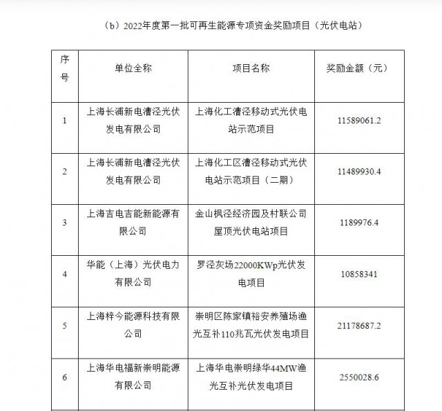 11月17日,上海市發(fā)改委發(fā)布了《上海市2022年度第一批可再生能源專項資金撥付計劃(草案)公示》。公示顯示,1175個分布式光伏項目將發(fā)放合計164093630.24元補(bǔ)貼,21757個居民分布式項目將獲得72711600.34元獎勵金額。
