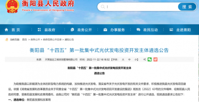 11月22日,湖南省衡陽縣“十四五”第一批集中式光伏發(fā)電投資開發(fā)主體遴選公告發(fā)布。