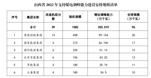 在煤電調(diào)峰安排清單中,主要企業(yè)為晉能、國家能源集團(tuán)、山西國際、京能、華能、大唐等6家央國企,增加調(diào)峰能力3.2GW,安排新能源規(guī)模0.96GW。