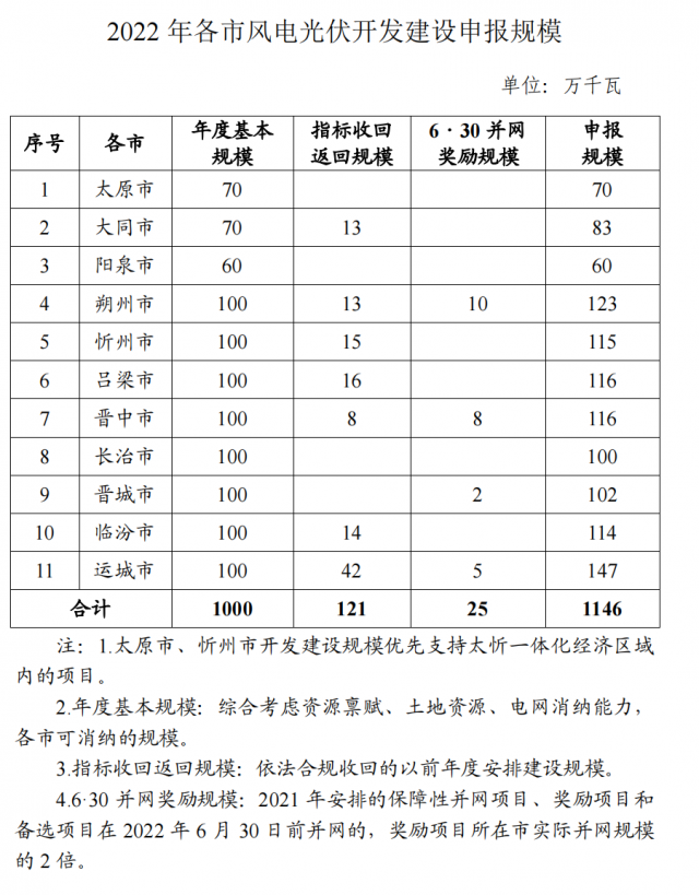 《通知》稱,工作目標(biāo)為,安排風(fēng)電、光伏保障性并網(wǎng)年度規(guī)模1000萬千瓦,獎勵規(guī)模146萬千瓦。根據(jù)該通知,2022年呂梁市年度風(fēng)、光規(guī)模共計116萬千瓦。