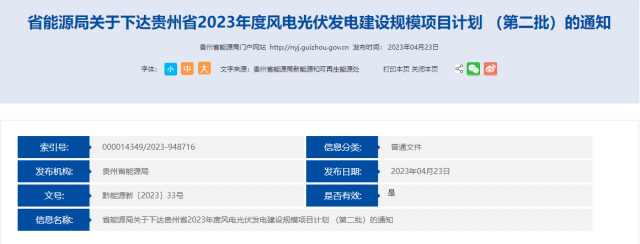 4月23日,貴州省能源局下達2023年度風電光伏發(fā)電建設(shè)規(guī)模項目計劃(第二批),總裝機為1258萬千瓦,其中風電930萬千瓦,光伏發(fā)電328萬千瓦,擬全部接入貴州電網(wǎng)。