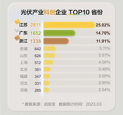 光伏產(chǎn)業(yè)技術(shù)迭代速度迅猛,屬于科技含量較高的成長(zhǎng)性行業(yè),啟信寶產(chǎn)業(yè)鏈數(shù)據(jù)庫從企業(yè)技術(shù)創(chuàng)新、科創(chuàng)資質(zhì)、研發(fā)實(shí)力、企業(yè)成長(zhǎng)性以及行業(yè)潛力5個(gè)維度對(duì)光伏企業(yè)進(jìn)行科創(chuàng)能力“掃描”后發(fā)現(xiàn),光伏產(chǎn)業(yè)鏈中,科創(chuàng)企業(yè)主要集中在江蘇、廣東、浙江三省,三省的科創(chuàng)企業(yè)數(shù)量約為2800家、1600家、1300家左右,分別占比25.02%、14.70%以及11.91%。江蘇成“存續(xù)企業(yè)”“科創(chuàng)企業(yè)”數(shù)量雙料榜首。