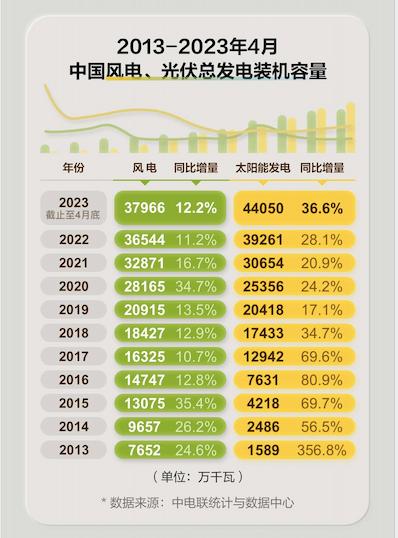 得益于雙碳政策和市場(chǎng)驅(qū)動(dòng),全國(guó)風(fēng)電、光伏發(fā)電新增裝機(jī)突破1.2億千瓦時(shí),連續(xù)三年突破1億千瓦。據(jù)國(guó)家能源局?jǐn)?shù)據(jù)顯示,截至4月底,我國(guó)風(fēng)電光伏發(fā)電總裝機(jī)已突破8億千瓦,占全國(guó)發(fā)電裝機(jī)的30.9%,約為36個(gè)三峽電站的總裝機(jī)容量。
