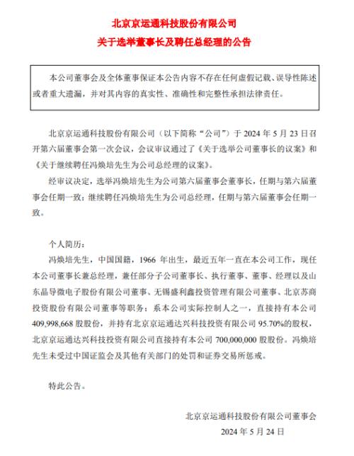 5月24日,京運通發(fā)布關于選舉董事長及聘任總經(jīng)理的公告。公告表示,5月23日,京運通召開第六屆董事會第一次會議,會議審議通過了《關于選舉公司董事長的議案》和《關于繼續(xù)聘任馮煥培先生為公司總經(jīng)理的議案》。經(jīng)審議決定,選舉馮煥培為京運通第六屆董事會董事長,任期與第六屆董事會任期一致;繼續(xù)聘任馮煥培先生為公司總經(jīng)理,任期與第六屆董事會任期一致。