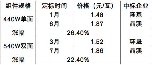 在價格方面,2021年上半年隨著組價集采的推進,組件價格受硅料上漲影響,其報價也呈現(xiàn)快速上漲的趨勢。從年初中核集團第一批1.3GW組件集采,隆基單面450組件報出1.48/瓦元的中標價格,到今年6月蒙能包頭50MW技術領跑項目中晶澳以450單面1.87元/瓦的中標價格拿下上半年“標王”,組件漲幅約26%左右。相較于去年1.55元/瓦的定標均價而言,今年440+組件已經來到1.7元/瓦上下;540雙面則由3月廣東電力第一批組件集采的1.52元/瓦的中標價上漲至7月廣東電力第三批組件集采的1.86元/瓦中標價格,漲幅約22.37%。