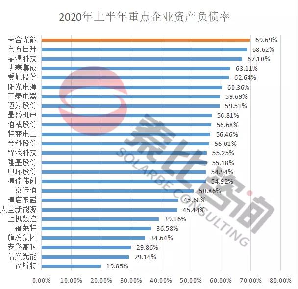 從資產(chǎn)負(fù)債率來看,索比咨詢統(tǒng)計(jì)的98家光伏企業(yè)總負(fù)債9103.98億元,平均負(fù)債率為49.8%,其中電站EPC企業(yè)的負(fù)債率最高,平均達(dá)到61.94%,*ST科林和*ST天龍面臨退市風(fēng)險;上游企業(yè)負(fù)債率為56.15%,輔材企業(yè)負(fù)債率最低,平均負(fù)債率為34.49%。