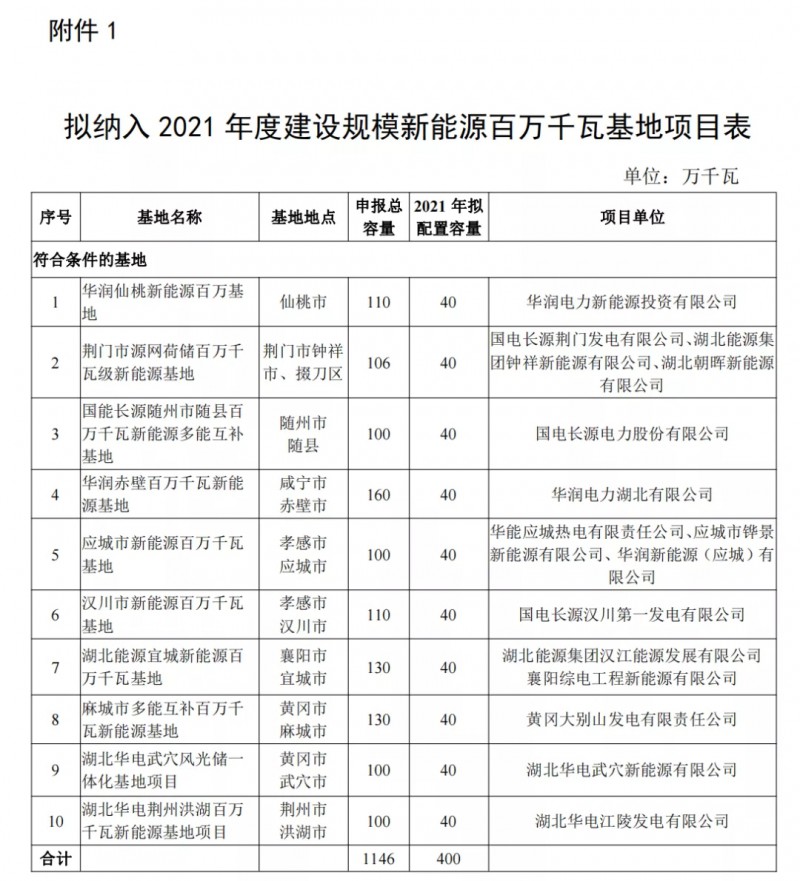 1)10新能源百萬(wàn)千瓦基地項(xiàng)目,總規(guī)模1146萬(wàn)千瓦 ,2021年實(shí)施400萬(wàn)千瓦;