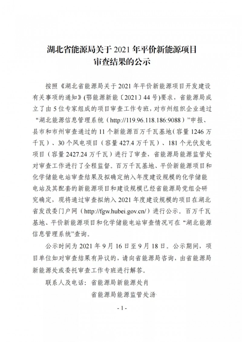 9月15日,湖北省能源局下發(fā)《關(guān)于2021年平價(jià)新能源項(xiàng)目審查結(jié)果的公示》,提出: