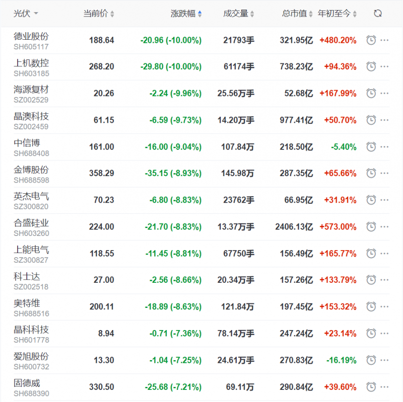 而近期掀起的又一波漲價潮,也最終反應(yīng)在資本市場。截止中午休盤時間,德業(yè)股份、上機(jī)數(shù)控主板跌停下跌10%、海源復(fù)材下跌9.96%、晶澳科技下跌9.73%、中信博下跌9.04%。