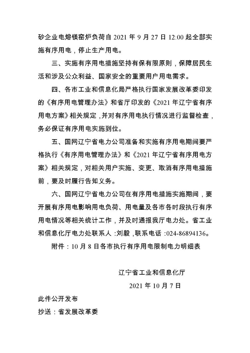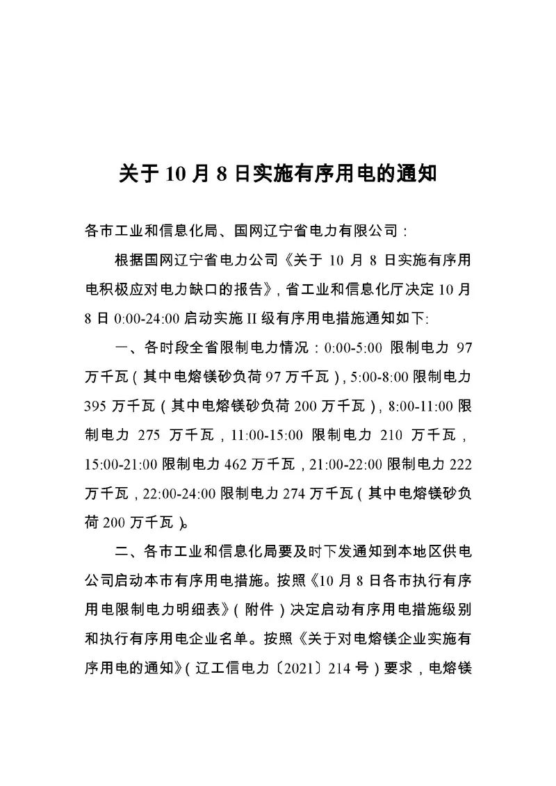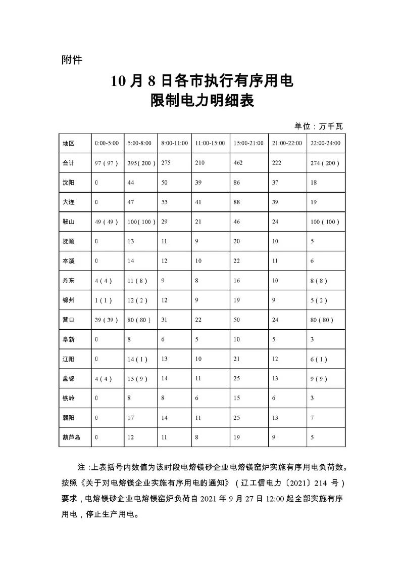 根據(jù)電力供需平衡預(yù)測,10月8日遼寧省最大電力缺口為462萬千瓦,依據(jù)國家發(fā)改委《有序用電管理辦法》,為嚴(yán)重缺電II級橙色預(yù)警。決定10月8日0:00-5:00限制電力97萬千瓦,5:00-8:00限制電力395萬千瓦,8:00-11:00限制電力275萬千瓦,11:00-15:00限制電力210萬千瓦,15:00-21:00限制電力462萬千瓦,21:00-22:00限制電力222萬千瓦,22:00-24:00限制電力274萬千瓦。