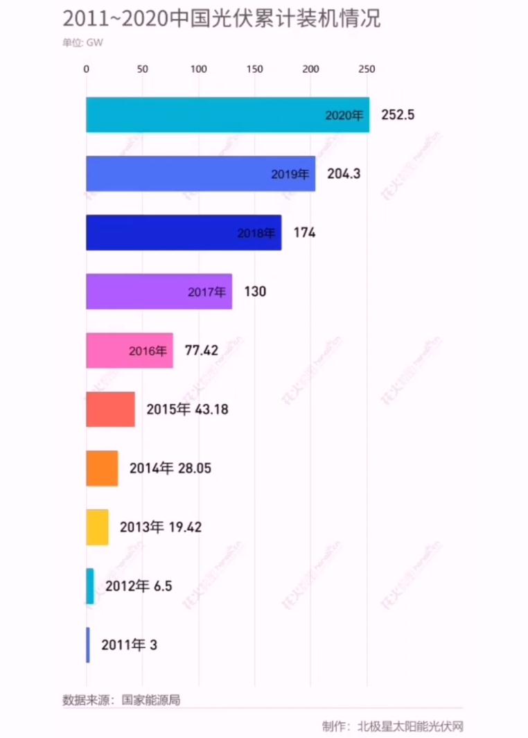 從2011年至2020年,中國光伏累計裝機從3GW增長至252.5GW,根據(jù)國家能源局數(shù)據(jù),截至2021年6月30日,中國光伏累計裝機已達267GW,十年飆漲880%。