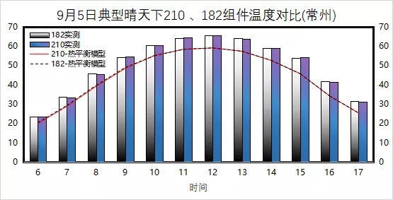 為探究組件真實戶外工作溫度,使用HIOKI熱電偶數(shù)據(jù)采集儀對組件進行工作溫度采集。實證結(jié)果顯示,210與對比測試樣件溫度幾乎無差異,根據(jù)輻照加權(quán)平均溫度,210組件甚至略低于對比組件0.5℃。使用PVsyst仿真,組件相同溫度系數(shù)的情況下,在常州,工作溫度每降低1℃,發(fā)電量提升約為0.2%。同時,選取9月5日典型天氣,將實測數(shù)據(jù)及實測氣象數(shù)據(jù)代入穩(wěn)態(tài)熱平衡模型,更證明了高電流、低開壓的210組件無明顯溫升,且在早晚輻照及溫度較低時,210組件組件工作溫度較低。