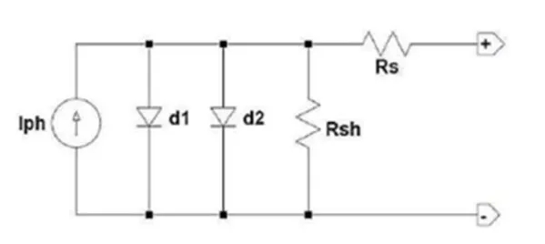 為研究210低輻照性能優(yōu)勢,本文以雙二極管模型對測試樣件進行建模分析;二極管模型表征電池及組件特性被廣泛使用,例如PVsyst中的PAN file; 在傳統(tǒng)的單二極管模型上,雙二極管模型額外考慮了耗盡區(qū)的復(fù)合損耗,可以有效驗證低輻照下組件性能: