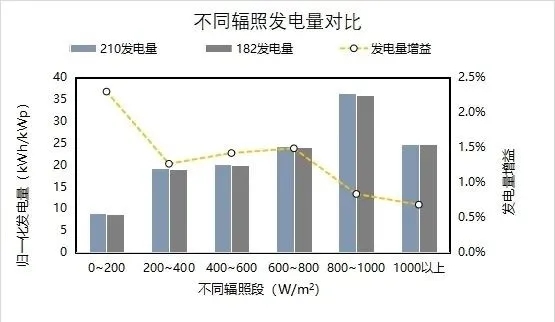 模擬結(jié)果顯示210組件低輻照性能PR200W/m2較182組件高1.3%