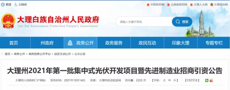 大理州2021年第一批集中式光伏開發(fā)項目暨先進(jìn)制造業(yè)招商引資公告
