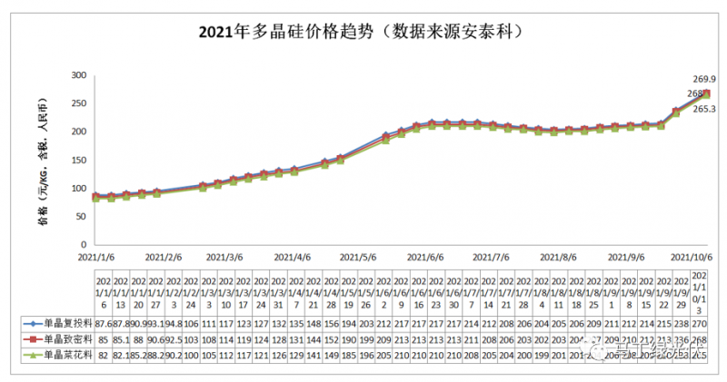 據(jù)安泰科的多晶硅價格公布,硅料已從年初87.6元/KG(單晶復投料)漲至現(xiàn)在的269.9元/KG,足足翻了3倍,而光伏組件的漲幅卻不足50%…