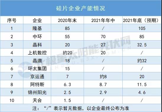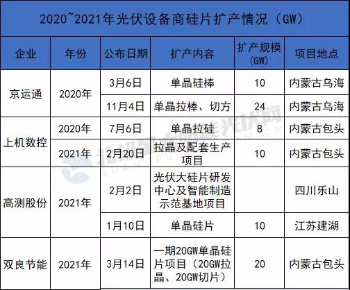 而2021年截至目前,隆基暫未公開硅片相關擴產計劃,2020年其在云南新擴70GW單晶產能。