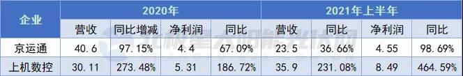 以鑄錠爐起家的京運通從2017年開始主攻硅片業(yè)務,截至2021年中,京運通單晶硅片產能約8GW,另有12GW新增產能處于爬產期,預計2021年底產能達20GW;切割設備商上機數(shù)控從2019 年通過全資子公司弘元新材進一步拓展單晶硅業(yè)務,截至2021年中,實際產能20GW。2020年以及2021年上半年,京運通、上機數(shù)控營收及凈利潤均實現(xiàn)了大幅增長,最高漲幅達464.59%,主要原因均指向硅片營收的大增。其中,上機數(shù)控2021年上半年營收及凈利潤均超過2020年全年。