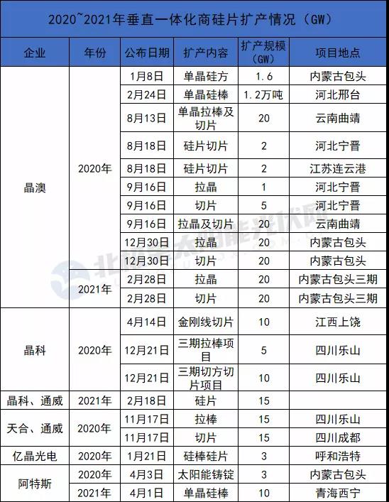 而2021年截至目前,隆基暫未公開硅片相關擴產計劃,2020年其在云南新擴70GW單晶產能。