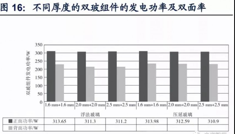 超白浮法玻璃力學性能更優(yōu),薄化后作為背板的發(fā)電功率接近超白壓延玻璃,陸續(xù)出現(xiàn)組件廠商采用超白浮法玻璃作為背板以降低成本。浮法玻璃表面平整度高,抗沖擊強度較壓延玻璃更為出色,并且隨著厚度降低,二者抗沖擊強度相差拉大,在1.6 mm浮法玻璃平均破碎高度高出超白壓延玻璃達97.77%。另外,雖然浮法玻璃透過率不如超白壓延玻璃,作為雙玻組件背板后會導致背面發(fā)電功率降低,但隨著厚度減小,二者發(fā)電功率差距逐漸降低,1.6mm雙玻組件下的背面發(fā)電功率相差僅為5.45W。浮法玻璃作為組件背板使用時,雙玻組件正面發(fā)電功率也可達到壓延玻璃作為背板時的發(fā)電功率。因此陸續(xù)有組件公司為降低生產成本,使用浮法玻璃作為背板。