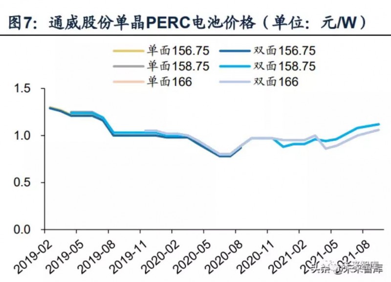 單雙面電池/組件幾乎同價,雙面增益滲透率不斷提升。根據Wind,通威股份PERC單雙面電池片報價已趨于一致。根據Solarzoom,一線廠商單雙面組件成交價差也在0.02元/W以內。由于雙面組件背面發(fā)電增益帶來的性價比提升,滲透率正在快速提升,根據CPIA統(tǒng)計,雙面組件市場份額已從2018年的2%提升至2020年的30%,預計2025年有望達到60%以上。