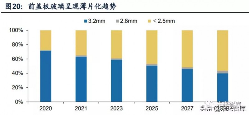 超薄光伏玻璃減少原片使用,助力降本同時順應雙面組件輕量化需求,有望成為雙玻組件主流產品。超薄光伏玻璃節(jié)省原片使用量,價格相對傳統(tǒng)光伏玻璃更低,市場份額將伴隨雙玻組件滲透逐年提升。根據CPIA統(tǒng)計,2020年2.5mm及以下厚度的前蓋板玻璃市占率約為29%,2025/2030年有望提升至47%/56%。