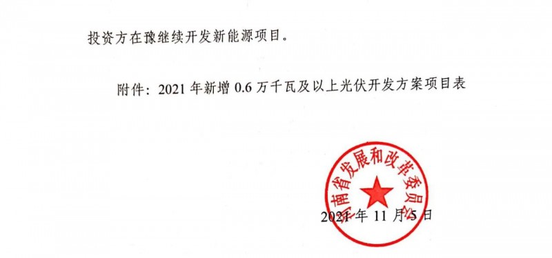 11月5日,河南省發(fā)改委下發(fā)《關(guān)于下達(dá) 2021年新增0.6萬千瓦及以上光伏項(xiàng)目開發(fā)方案的通知》。文件指出,對(duì)于不新增用地、利用固定建筑物及其附屬場所建設(shè)的光伏項(xiàng)目,不限申報(bào)規(guī)模!