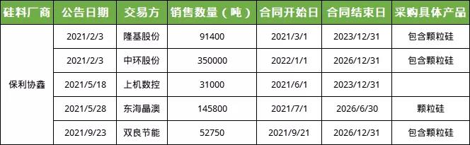 保利協(xié)鑫與下游客戶陸續(xù)簽訂采購長單:保利協(xié)鑫與隆基、中環(huán)、上機、晶澳、雙良等下游客戶簽訂硅料采購長單,總供應(yīng)量68.46萬噸,年均供應(yīng)量22.82萬噸;其中,隆基、中環(huán)、雙良采購產(chǎn)品中明確包含顆粒硅產(chǎn)品,晶澳將于未來5年向協(xié)鑫采購總計14.58萬噸顆粒硅;而上機則將與保利協(xié)鑫共建30萬噸顆粒硅產(chǎn)能。下游客戶長單采購表明了顆粒硅進一步獲得認(rèn)可。