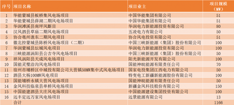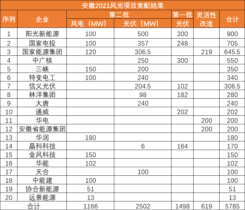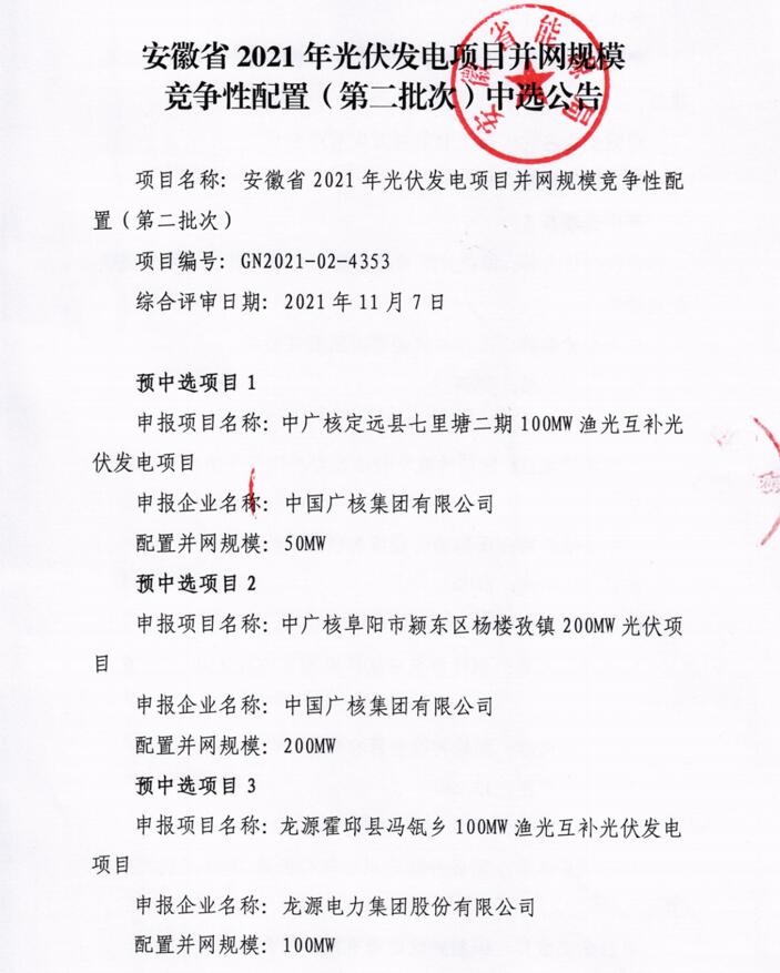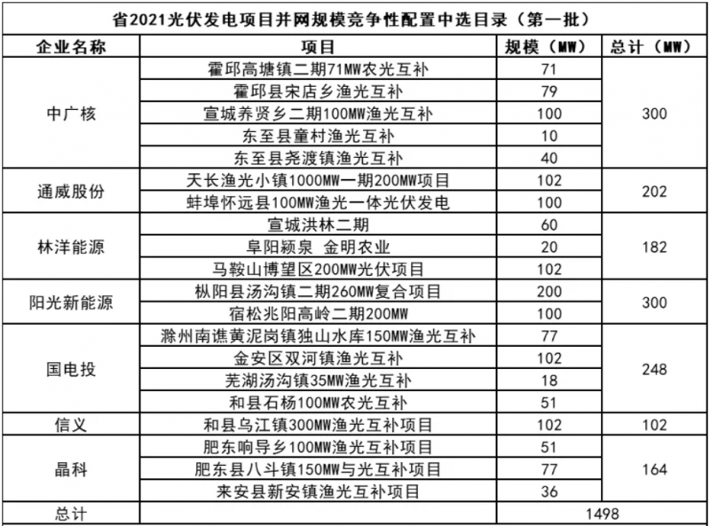 此前10月21日,安徽省能源局下發(fā)《2021年光伏發(fā)電項目并網(wǎng)規(guī)模競爭性配置(第一批次)中選公告》,規(guī)模共計1498MW。中廣核、陽光新能源、國家電投、通威、林洋、晶科、信義光能等7家企業(yè)中標(biāo)20個光伏第一批優(yōu)選項目。加上此次安徽省總共公示了4GW光伏、1.166GW風(fēng)電項目。