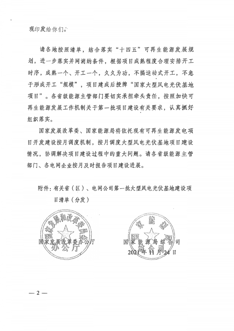 根據(jù)文件,請(qǐng)各地按照清單,結(jié)合落實(shí)“十四五”可再生能源發(fā)展規(guī)劃,進(jìn)一步落實(shí)并網(wǎng)消納條件,根據(jù)項(xiàng)目成熟程度合理安排開工時(shí)序,成熟一個(gè)、開工一個(gè),久久為功,不搞運(yùn)動(dòng)式開工,不急于形成開工“規(guī)模”,項(xiàng)目建成后授牌“國(guó)家大型風(fēng)電光伏基地項(xiàng)目”。各省級(jí)能源主管部門要切實(shí)承擔(dān)牽頭責(zé)任,按照加快可再生能源發(fā)展工作機(jī)制關(guān)于第一批項(xiàng)目建設(shè)有關(guān)要求,認(rèn)真抓好組織落實(shí)。