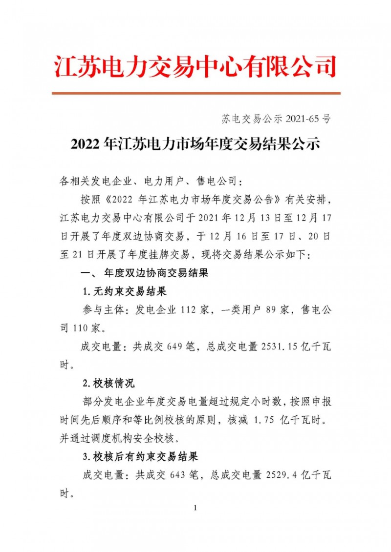 12月23日,江蘇電力交易中心有限公司發(fā)布了2022年江蘇電力市場年度交易結(jié)果。江蘇電力交易中心有限公司于2021年12月13日至12月17日開展了年度雙邊協(xié)商交易,于12月16日至17日、20日至21日開展了年度掛牌交易。