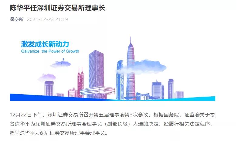深交所消息,12月22日下午,深圳證券交易所召開第五屆理事會第3次會議,根據(jù)國務院、證監(jiān)會關于提名陳華平為深圳證券交易所理事會理事長(副部長級)人選的決定,經(jīng)履行相關法定程序,選舉陳華平為深圳證券交易所理事會理事長。