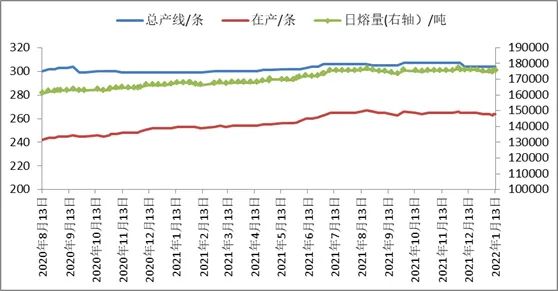 供應(yīng)方面,截至1月13日,全國浮法玻璃生產(chǎn)線共計(jì)304條,在產(chǎn)264條,日熔量共計(jì)175225噸,環(huán)比前一周增加400噸/日。周內(nèi)生產(chǎn)線點(diǎn)火1條,冷修1條,改產(chǎn)1條。漳州旗濱玻璃有限公司800噸/日四線冷修完成,1月11日點(diǎn)火復(fù)產(chǎn)。重慶市賽德化工有限公司400噸/日一線窯爐到期,1月10日放水冷修。滕州金晶玻璃有限公司800噸/日四線原產(chǎn)白玻,1月10日投料改產(chǎn)超白。后期湖北明弘700噸/日生產(chǎn)線計(jì)劃20日冷修;本溪玉晶一條800噸/日生產(chǎn)線計(jì)劃復(fù)產(chǎn),一條700噸/日生產(chǎn)線計(jì)劃停產(chǎn)。光伏玻璃方面,深圳南玻一條600噸/日計(jì)劃本月末前冷修放水,福萊特一條600噸/日生產(chǎn)線計(jì)劃點(diǎn)火。玻璃生產(chǎn)利潤尚可,玻璃企業(yè)冷修計(jì)劃或有所延后。