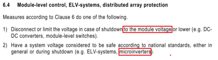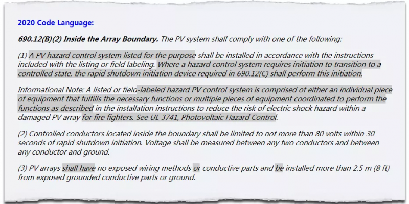 規(guī)范每三年更新一次,在全美范圍內(nèi)有效,但不同的州可執(zhí)行不同版本的規(guī)范。在最新版的NEC2020文件中要求:以距離到光伏矩陣305mm為界限,界限范圍外,在觸發(fā)設(shè)備啟動(dòng)后30S內(nèi),電壓降低到30V以下,界線范圍內(nèi),要求具有“光伏危險(xiǎn)控制系統(tǒng)”,或在觸發(fā)設(shè)備啟動(dòng)后30S內(nèi),將電壓降低到80V以下,也就是要求實(shí)現(xiàn)“組件級(jí)關(guān)斷”。